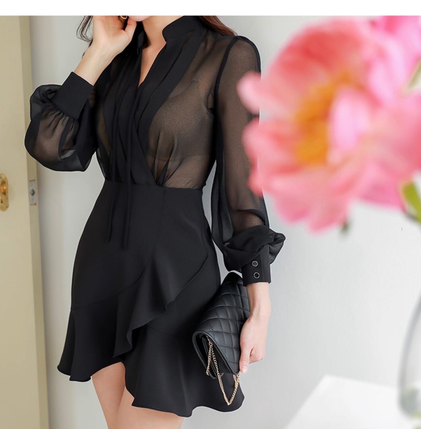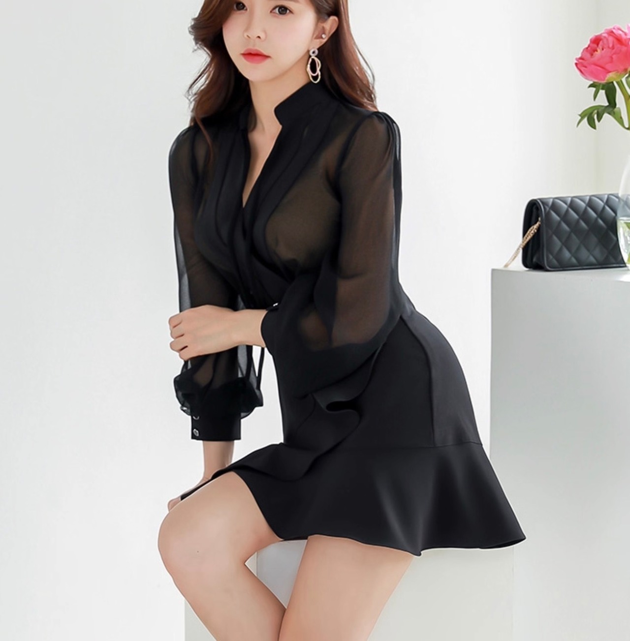 レディース ワンピース デート ワンピドレス ショート ショート丈 袖あり 長袖 ボリューム袖 ホルンスリーブ 萌袖 Vネック 襟付き スタンドカラー セミフレア 切り替えデザイン 透け感 シースルー 薄手 かわいい 大人可愛い きれいめ シンプル カジュアル 上品 おしゃれ お洒落 レトロ 大人女子 こなれ感 ラフ ラブリー キュート ガーリー 個性的 クール モード系 エレガント モダン 主役級 存在感 抜け感 無地 レディース デート お出かけ 女子会 休日 コーデ スタイル モテ 定番 | SPARKJOY レディースファッション