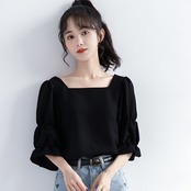 こちらのカットソーは、5分袖とスクエアネックのデザインが特徴の、女性らしさを引き立てる一着です。
