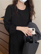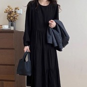 長袖とウエストマークが女性らしいシルエットを強調し、ラウンドネックで上品さもプラス。