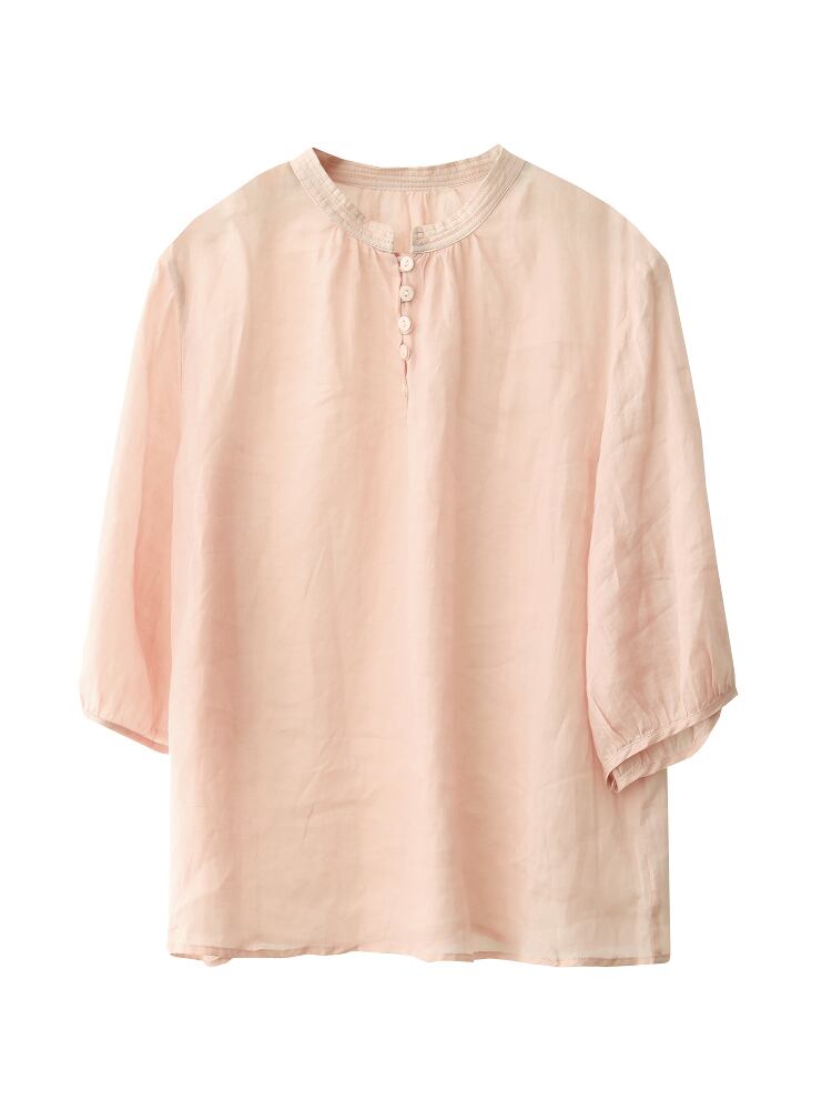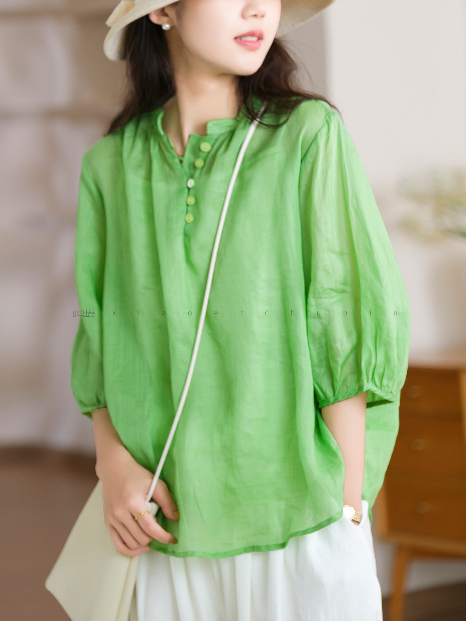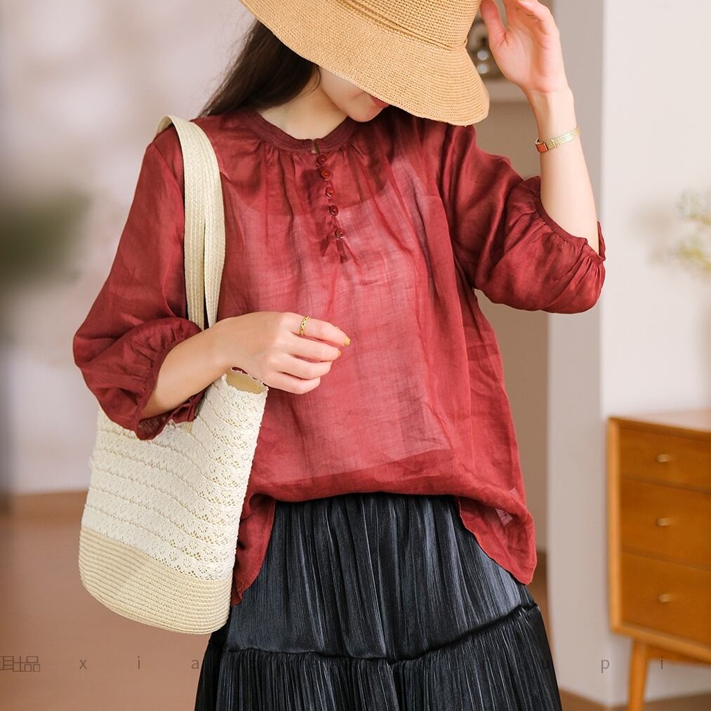 トップス ブラウス 5分袖 ボリューム袖 クルーネック プルオーバー ショート丈 シースルー ハーフボタン かわいい 可愛い 大人可愛い きれいめ シンプル 上品 レトロ おしゃれ かっこいい カジュアル レトロ こなれ感 個性的 主役級 存在感 抜け感 春 夏 ベーシック ナチュラル エレガント 無地 女性用 レディース ママ OL 通勤 オフィス 学生 通学 デート お出かけ お泊まり 女子会 旅行 休日 アウトドア カフェ ショッピング コンパ 普段使い デイリー 着回し 重ね着 ワンサイズ | SPARKJOY レディースファッション