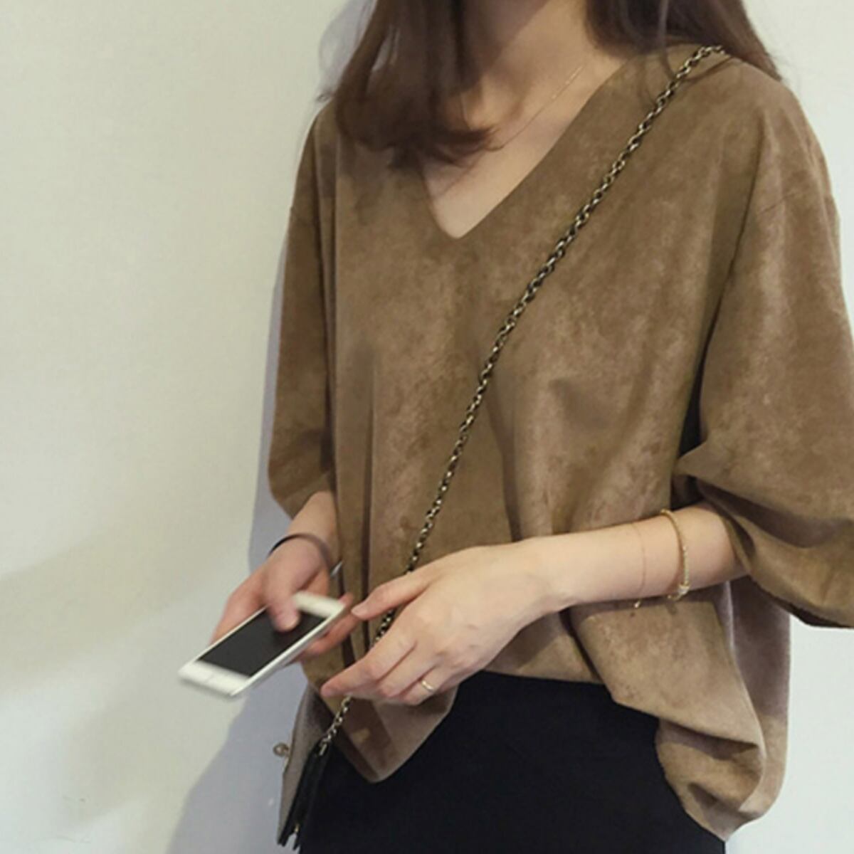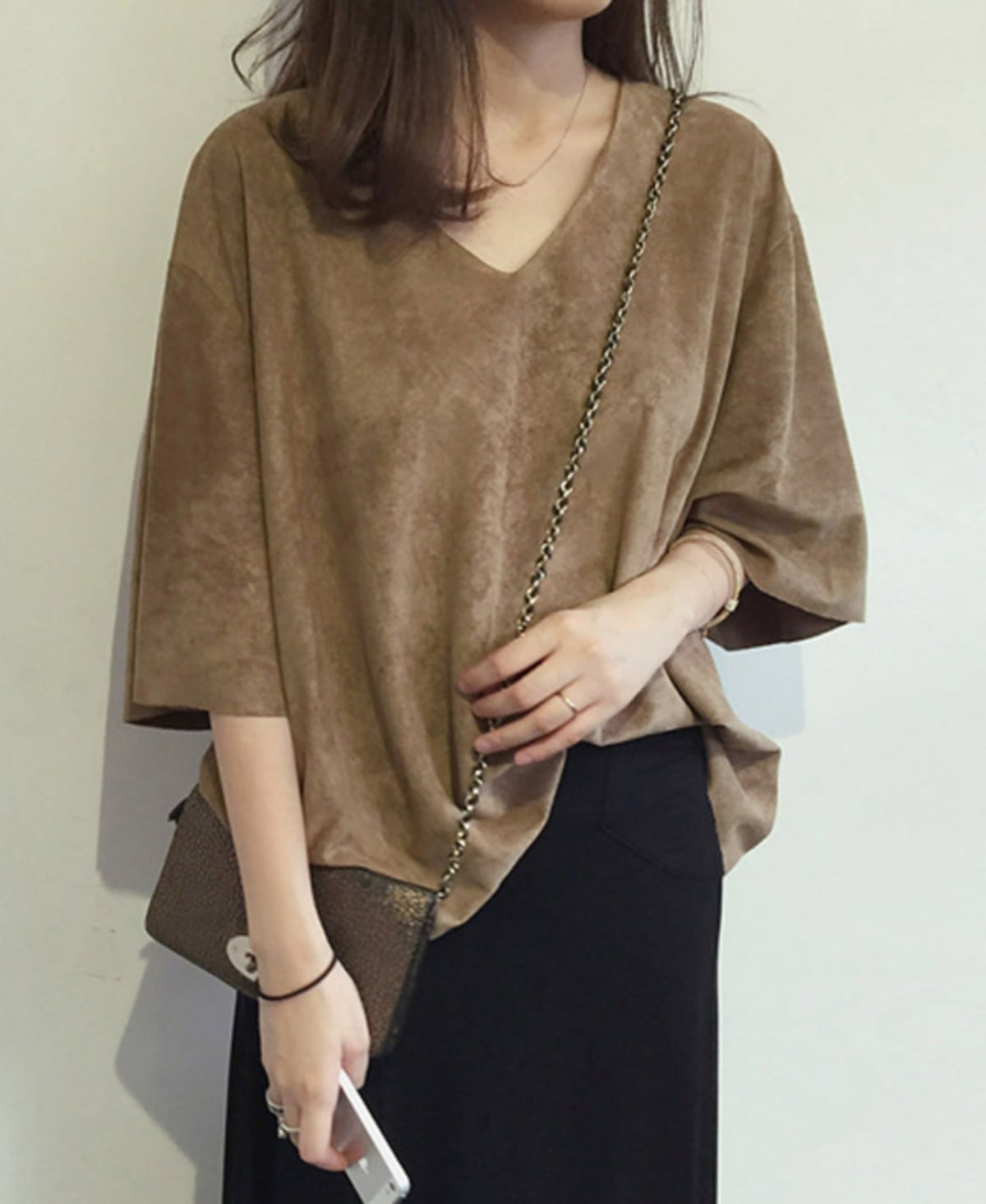 トップス カットソー Tシャツ 5分袖 Vネック プルオーバー ミディアム丈 スエード かわいい 可愛い 大人可愛い きれいめ シンプル 上品 レトロ おしゃれ かっこいい カジュアル レトロ こなれ感 個性的 主役級 存在感 抜け感 春 夏 ベーシック ナチュラル クール 無地 女性用 レディース ママ OL 通勤 オフィス 学生 通学 デート お出かけ お泊まり 女子会 旅行 休日 アウトドア カフェ ショッピング コンパ 普段使い デイリー 着回し 重ね着 S M L XL 2XL トレンド モテ | SPARKJOY レディースファッション
