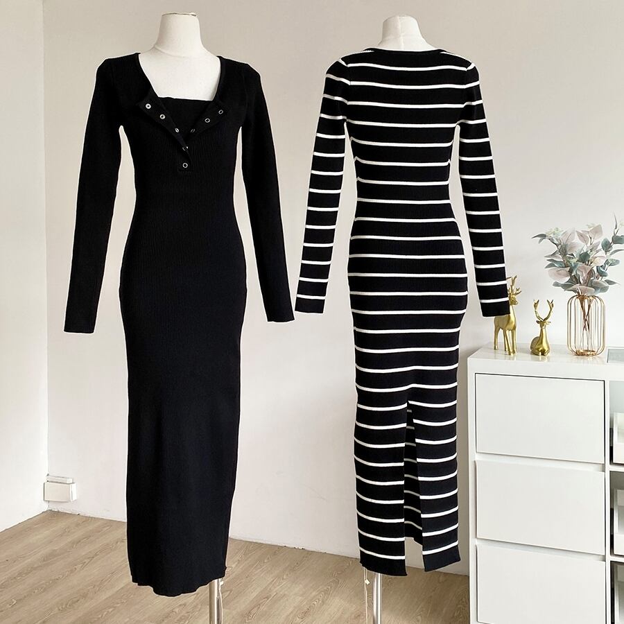 ワンピース ロングワンピース ニットワンピース 長袖 ハーフボタン タイトワンピース ロング丈 バックスリット かわいい 大人可愛い きれいめ シンプル 上品 おしゃれ レトロ カジュアル こなれ感 個性的 役級存在感 抜け感 春 秋 冬 ベーシック ナチュラル キュート ボーダー柄 女性用 レディース ママ OL 通勤 オフィス 学生 通学 デート お出かけ お泊まり 女子会 旅行 休日 カフェ ショッピング コンパ 普段使い デイリー 着回し 重ね着 脚長 ワンサイズ トレンド モテ スレンダー | SPARKJOY レディースファッション