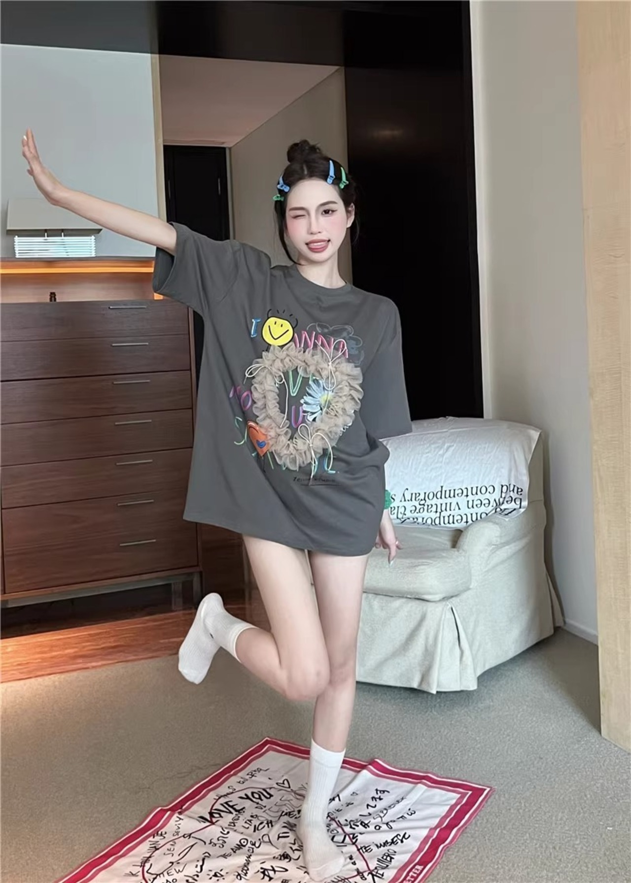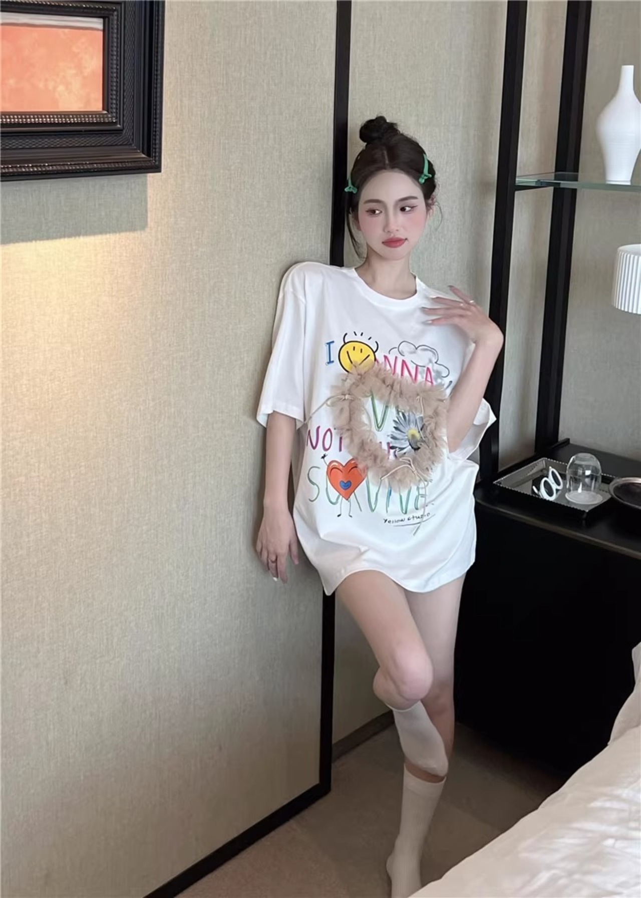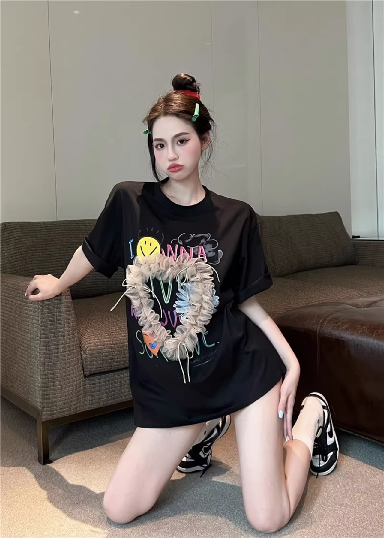 オーバーサイズのワイドなシルエットとUネックデザインが、カジュアルでありながらもおしゃれな雰囲気を醸し出します。ミモレ丈とチュールリボンデザインが加わり、個性的で可愛らしい印象に仕上がっています!ストリートコーデやデート、女子会など、さまざまなシーンで主役級の存在感を発揮すること間違いなしです。