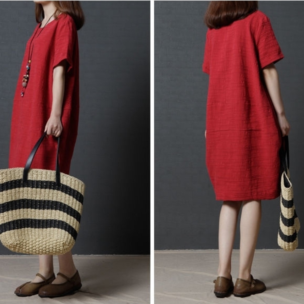 おしゃれと快適さを兼ね備えた、ミディアム丈の半袖ワンピースです。