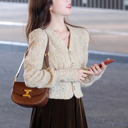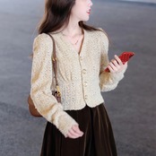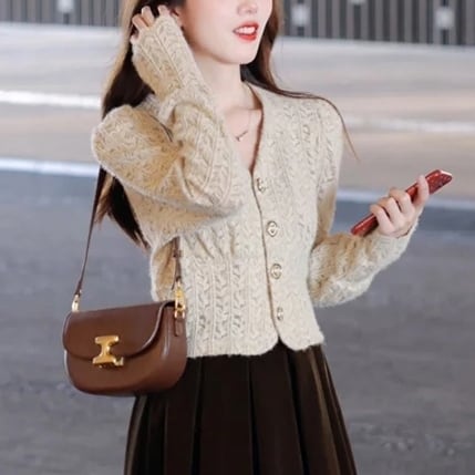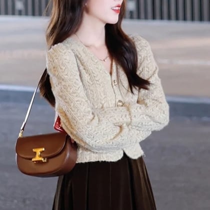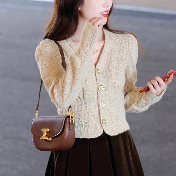 この「カーディガン」は、春や秋の季節にぴったりな長袖のパフスリーブデザインが魅力です!