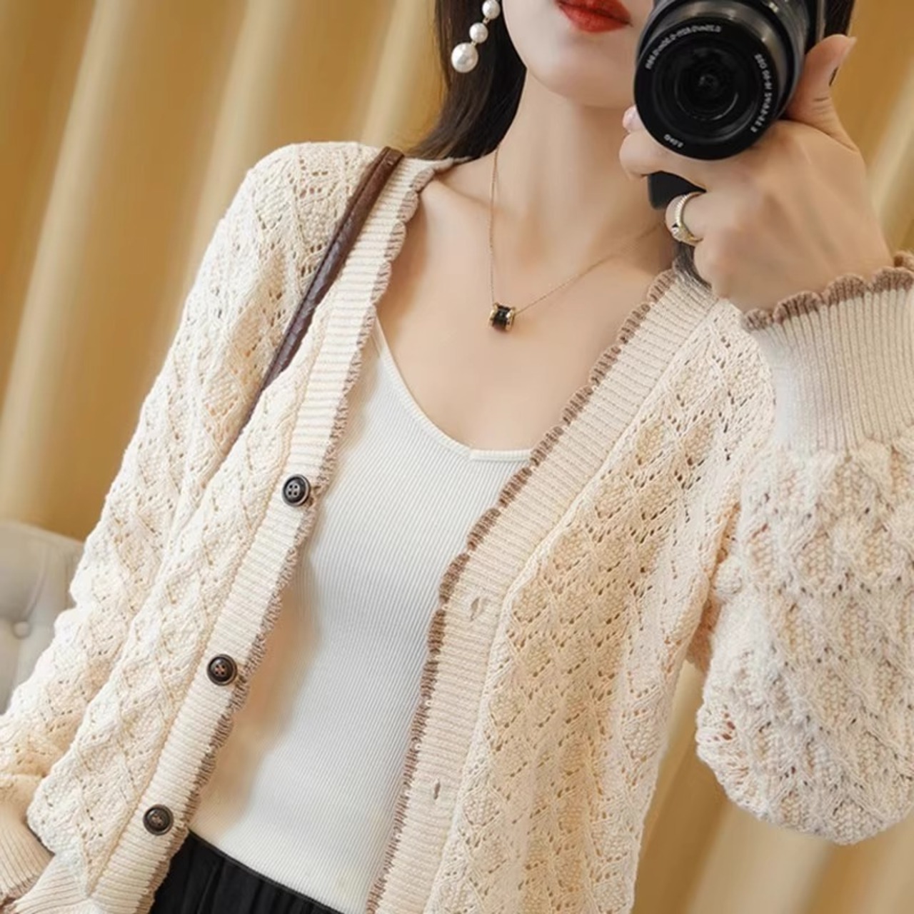 Vネックデザインと襟なしのシンプルなスタイルが特徴で、前開きのボタン仕様がこなれた印象を与えます。リブ編みのケーブルニットが肌触り良く、フェミニンでありながらカジュアルな印象も兼ね備えています!