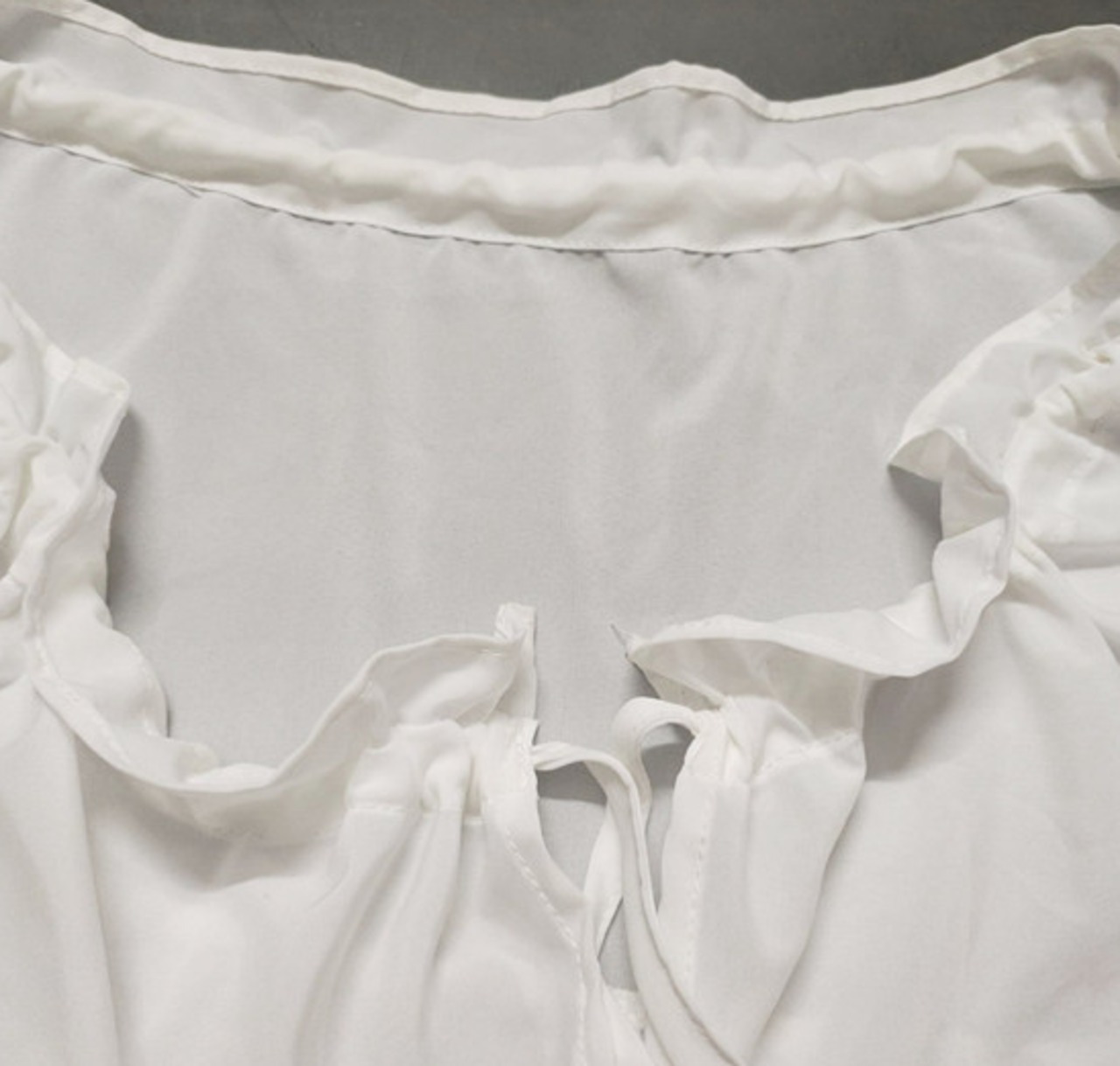 ドロップショルダーのリラックス感と、襟元のりぼんタイやフリルがフェミニンな雰囲気を引き立てます。
