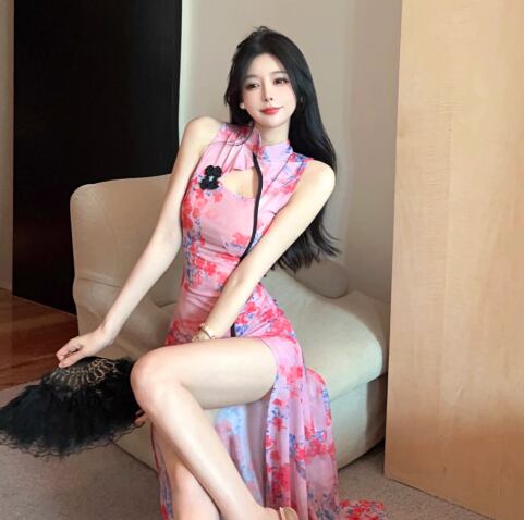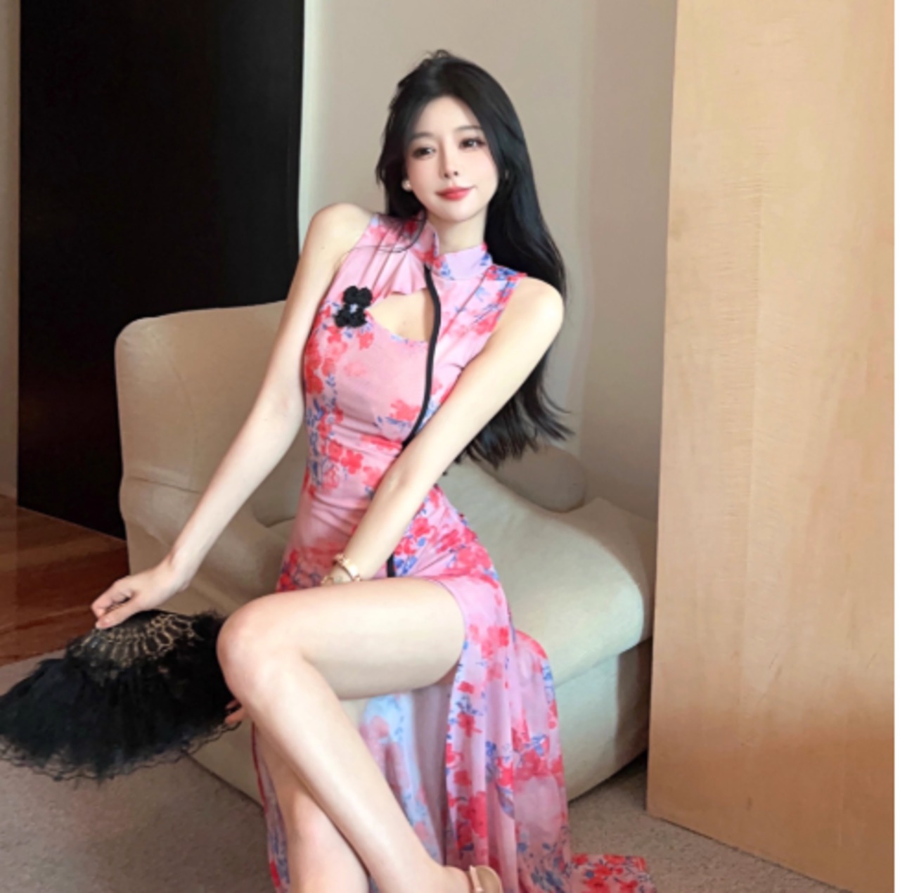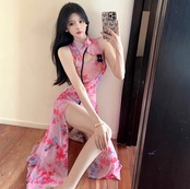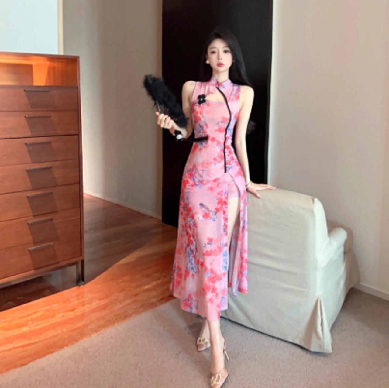タッセル チャイナボタン ドレス ワンピース ステージ 舞台 キャバ 衣装 コスプレ コスチューム ラウンジ クラブ ミディアム丈 半袖 ノースリーブ フレア チャイナドレス 透け感 シースルー 可愛い シンプル カジュアル 大人可愛い 上品 おしゃれ アジアン 抜け感 イベント 春 夏 S M L ピンク | SPARKJOY レディースファッション