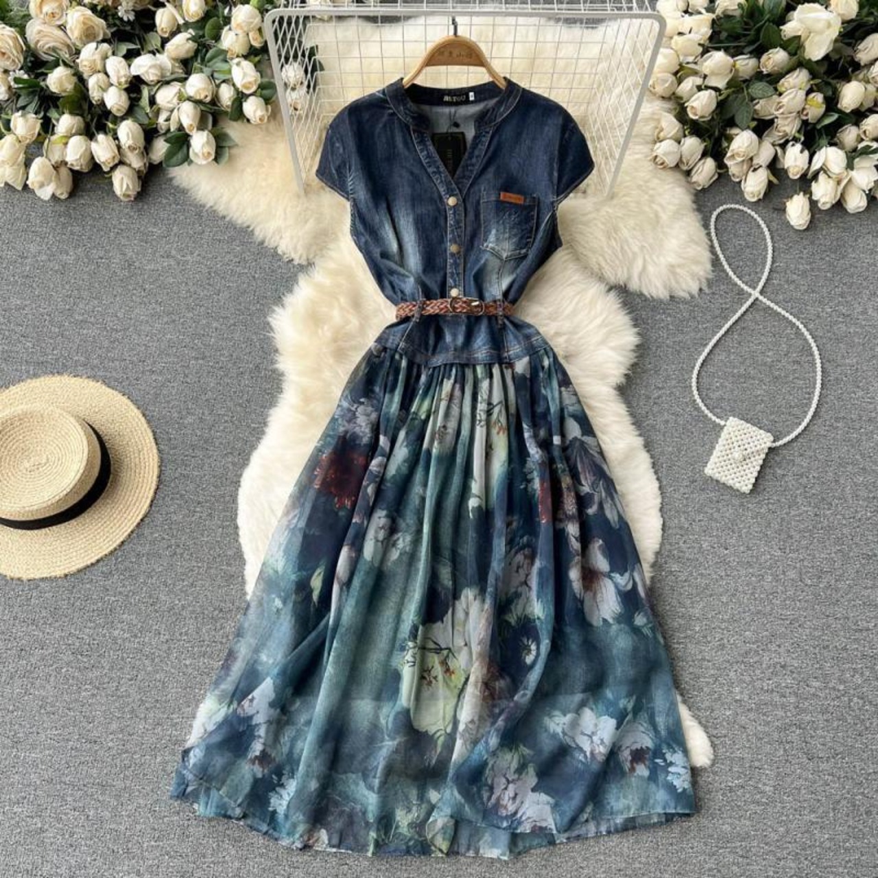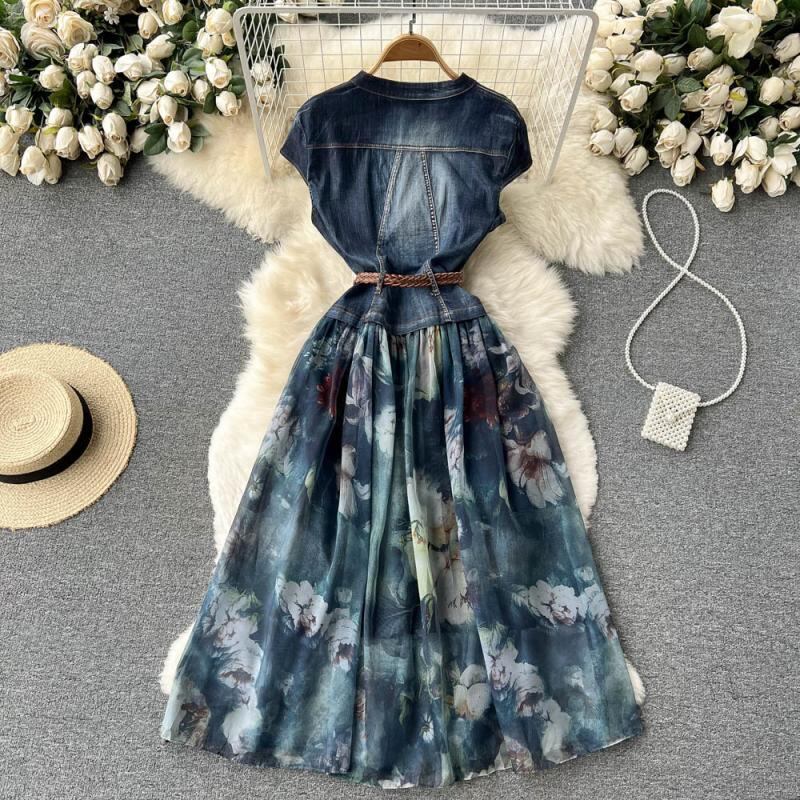 レディース ワンピース ロング 半袖 Vネック フレア Aライン シフォン ウエストマーク ポケット ボタン 切り替えデザイン デニム かわいい 大人可愛い きれいめ シンプル カジュアル 上品 おしゃれ かっこいい レトロ アジアン エスニック エキゾチック こなれ感 ラフ 個性的 クール エレガント モダン ナチュラル 無地 プリント 春 夏 デート お出かけ 旅行 休日 バカンス ショッピング カフェ コーデ 楽ちん 普段使い モテ 清楚 M L XL 2XL ベーシックカラー 大人カラー 春カラー | SPARKJOY レディースファッション